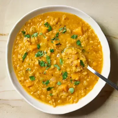 Home-style lentil soup, ground lentils blended with fresh herbs and mild spices, a hearty plant protein dish, solidly vegan and flavorful